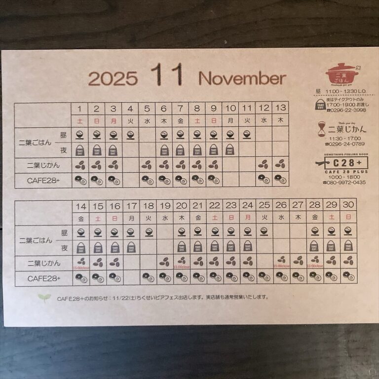 11月の営業案内です。3連休が2回ありますね。お出かけシーズンの11月です。 先日、茨城の観光スポッ […] -
