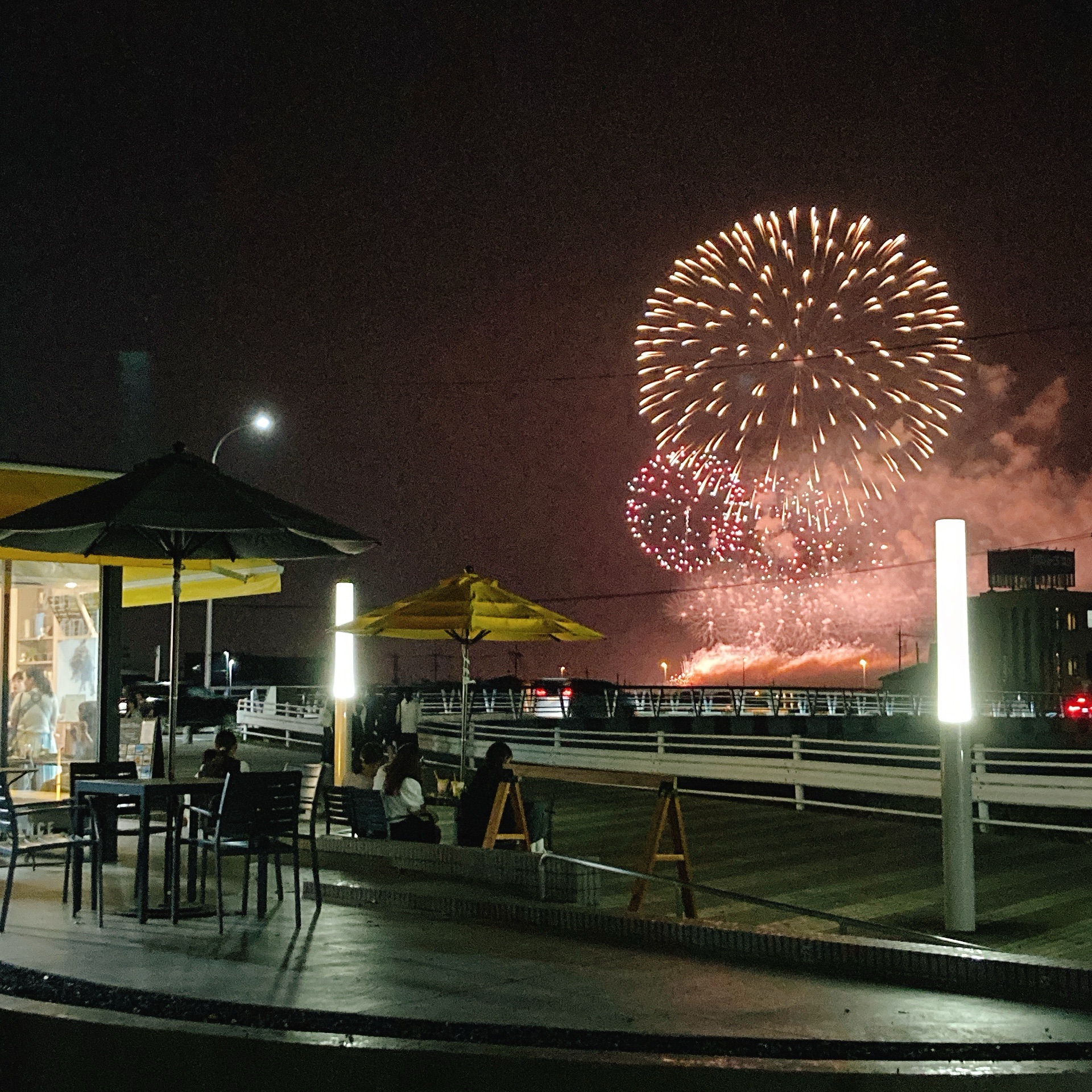 実は、花火がニーハチテラス前広場からよく見えるので、