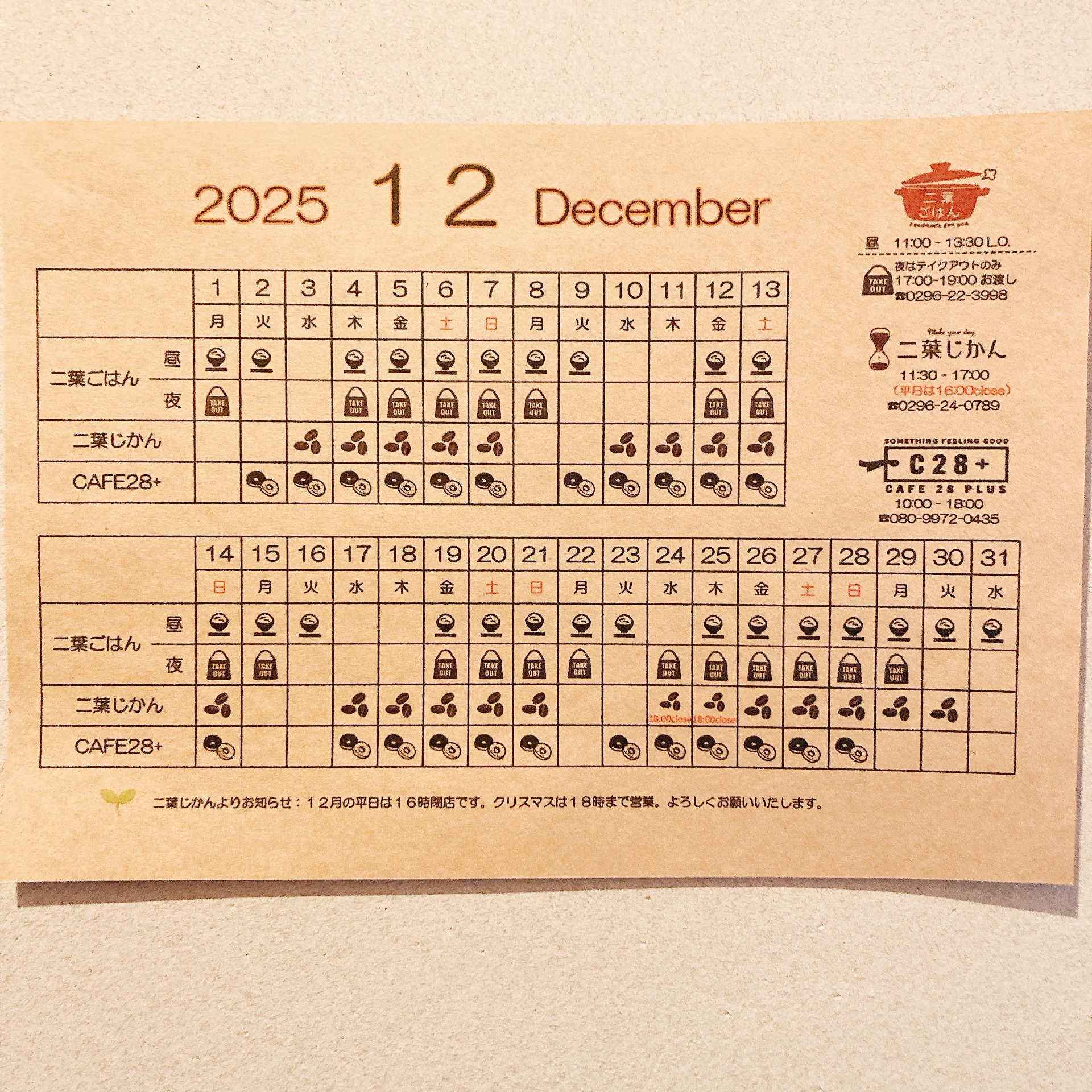 二葉じかんよりご案内で、12月の平日営業は16:00閉店となります。よろしくお願いします。