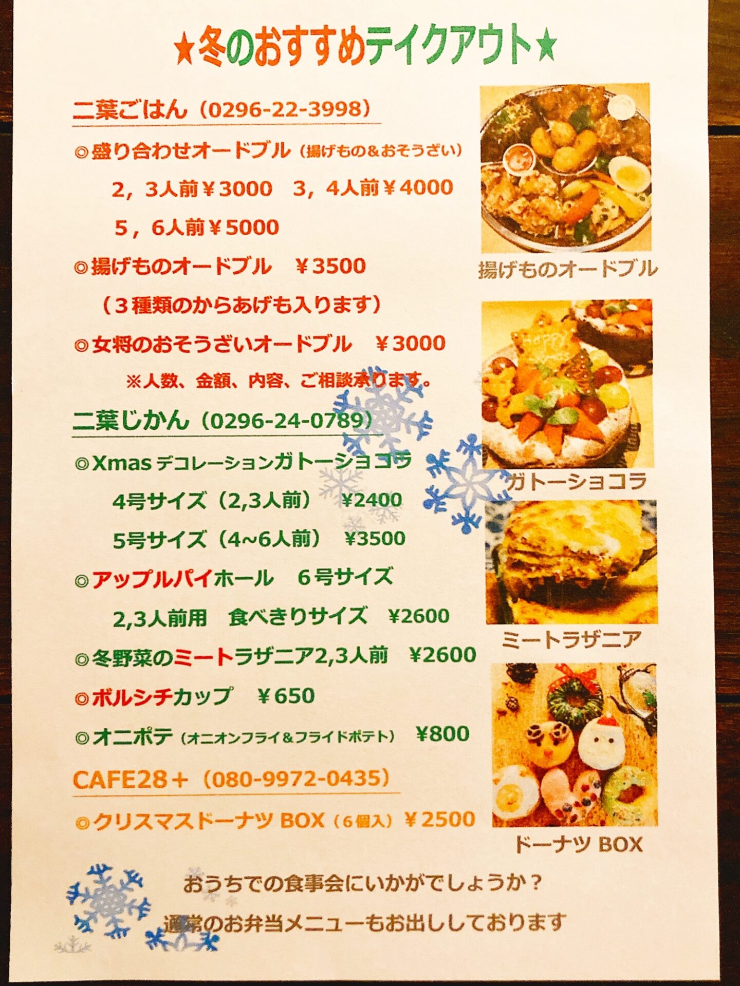 クリスマスケーキや、この時期限定のミートラザニアを。
