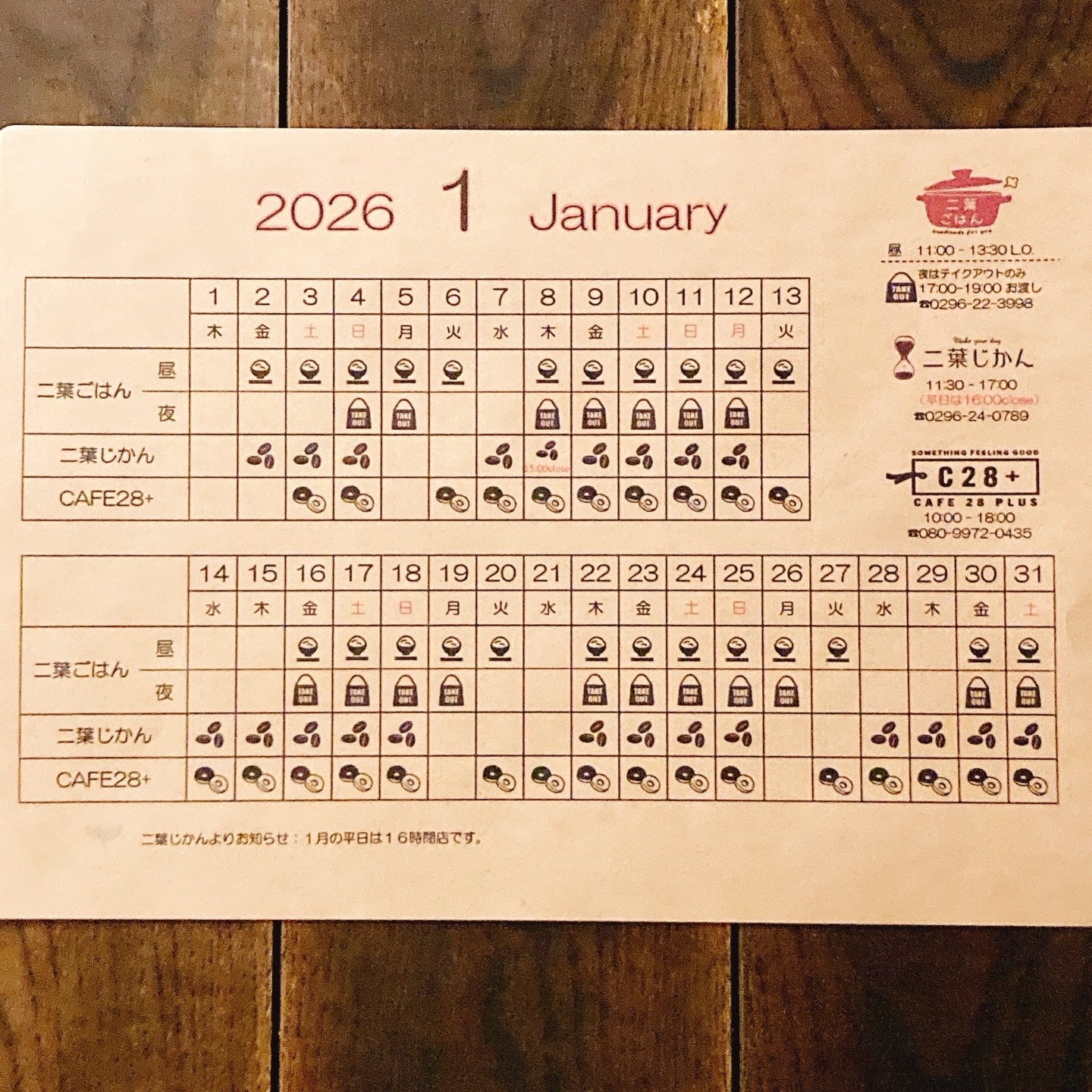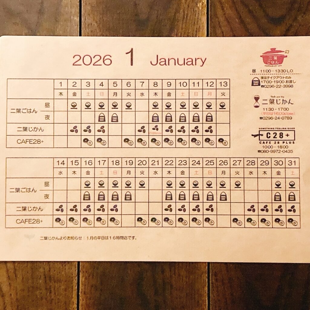 1月営業スケジュール 投稿日 2026年1月7日 著者 マスター カテゴリー お知らせ 1月営業スケジュール、こちらです。 二葉じかんは平日16:00クローズです。よろしくお願いします。 CAFE28+は1/12(月祝) 10-16時の【しもだてアパートメントの仲間たちinだるま市】に出店いたします。お正月限定の紅白だるまドーナツお出しいたします!実店舗でも12日までご提供しています。縁起もの食べて運気アップ⤴︎いかがでしょうか? この記事を書いた人 マスター 記事一覧